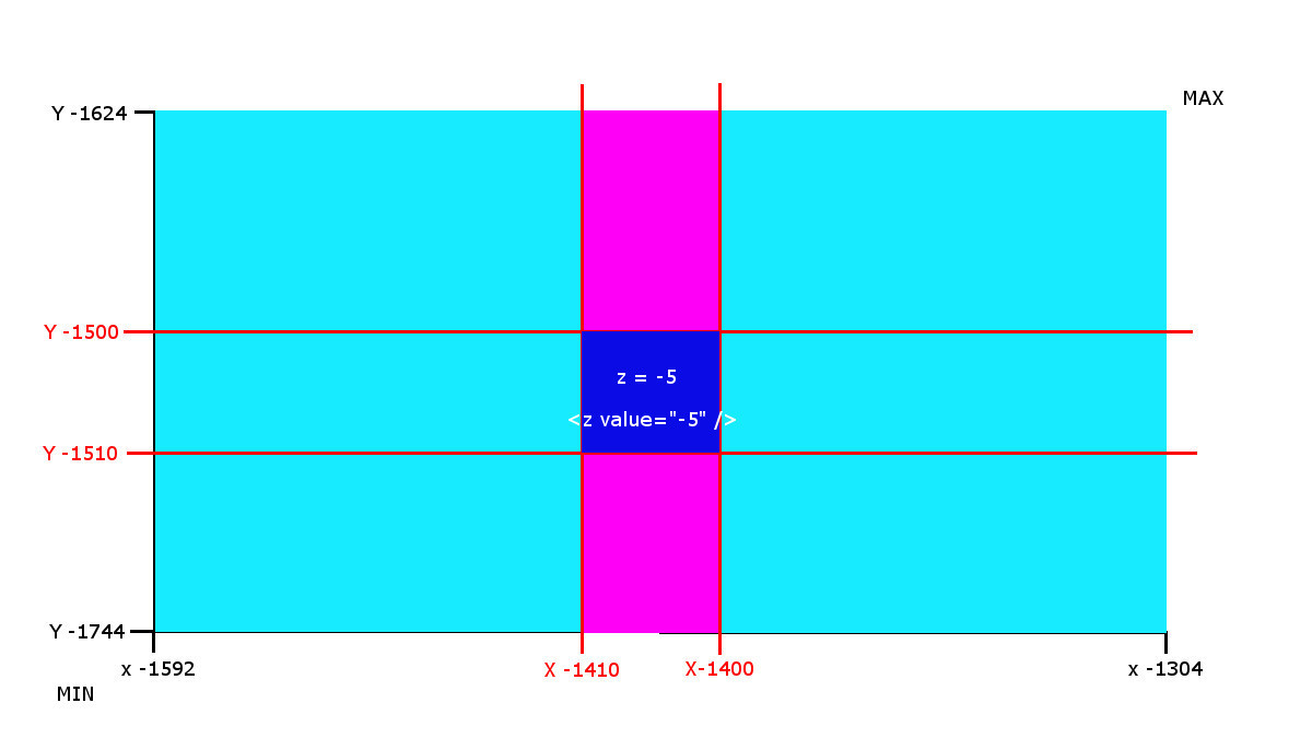 In the chart I highlighted in blue areas of the new created rectangles. Observing the coordinates in the graph is easy to understand which new coordinates to enter in water.xml file.